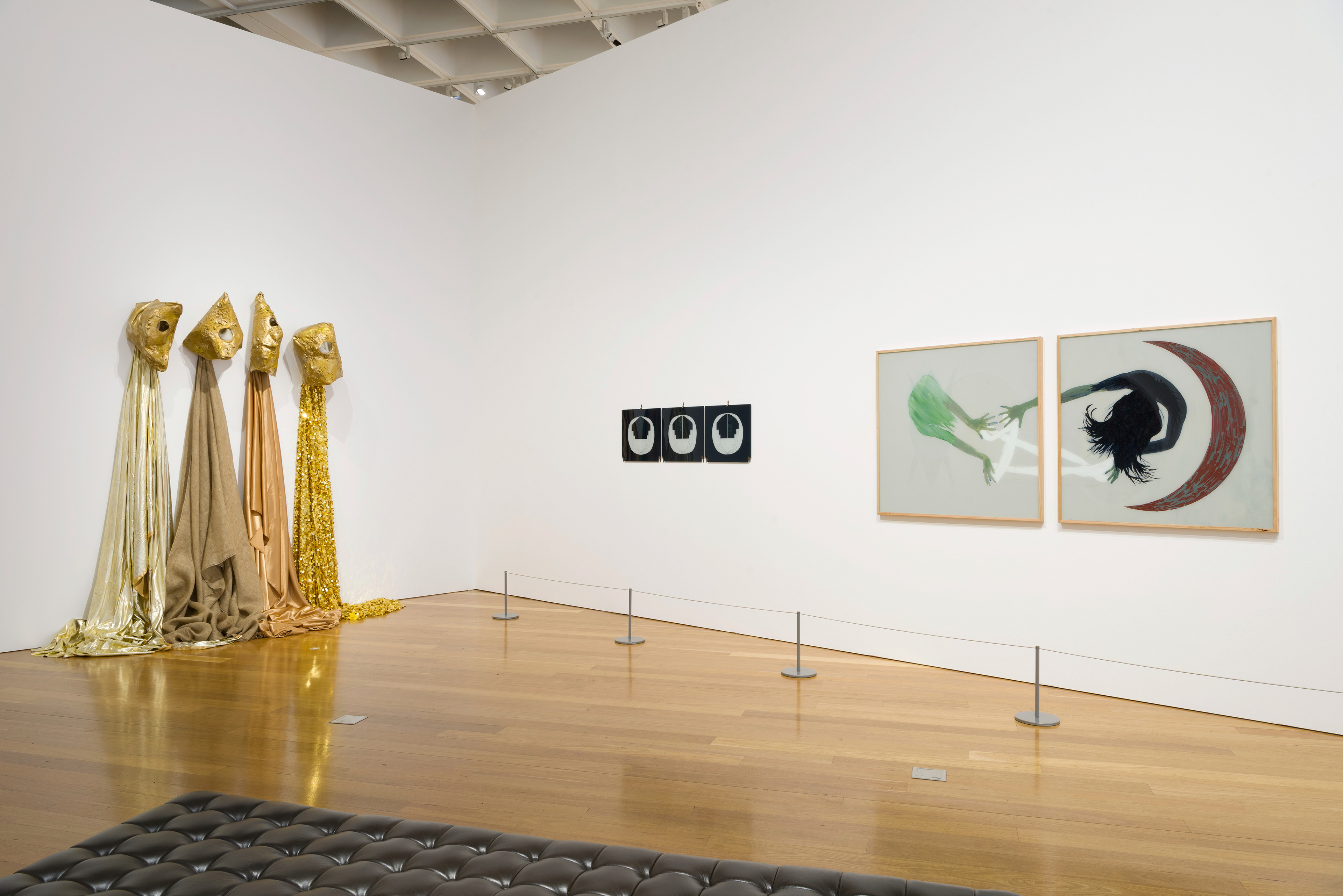 Living Patterns: Contemporary Australian Abstraction, installation view, Mikala Dwyer, The Collapzars, 2012, Clare Milledge, Three shouts on a hill, 2021, Sruth, 2021, QAGOMA - Queensland Art Gallery of Modern Art, Meanjin/Brisbane